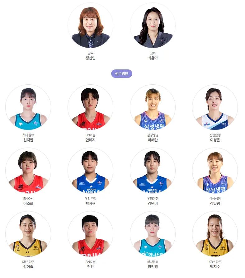 여자 농구 국가대표팀은 정선민 감독이 이끌고 있으며, 강이슬(KB), 김단비(우리), 박지수(KB), 박지현(우리), 신지현(하나), 안혜지(BNK), 이경은(신한), 이소희(BNK), 이해란(삼성), 양인영(하나), 진안(BNK), 최이샘(우리) 등 12명의 선수로 구성되어 있습니다.